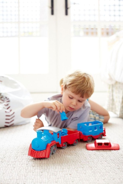 All aboard! The Green Toys® Train is pulling out of the station! This sturdy locomotive is ready to chug along from one eco-friendly adventure to the next. Made in the USA from 100% recycled plastic milk jugs that save energy and reduce greenhouse gas emissions, the brightly-colored steam engine pulls two additional cars that link together to form a long train, or easily unhook for stand-alone play. The open wagon is perfect for hauling all kinds of sustainable cargo, while the caboose features a spacious interior and removable roof. Two conductor bear figures are included with the set, encouraging open play as little engineers' imaginations lay the tracks for all sorts of creative narratives. With no metal axles or external coatings, the Green Toys® Train is safe and versatile for both indoor and outdoor play, and is dishwasher safe for easy cleaning. No BPA, phthalates, or PVC. Packaged using recycled and recyclable materials and printed with soy inks.