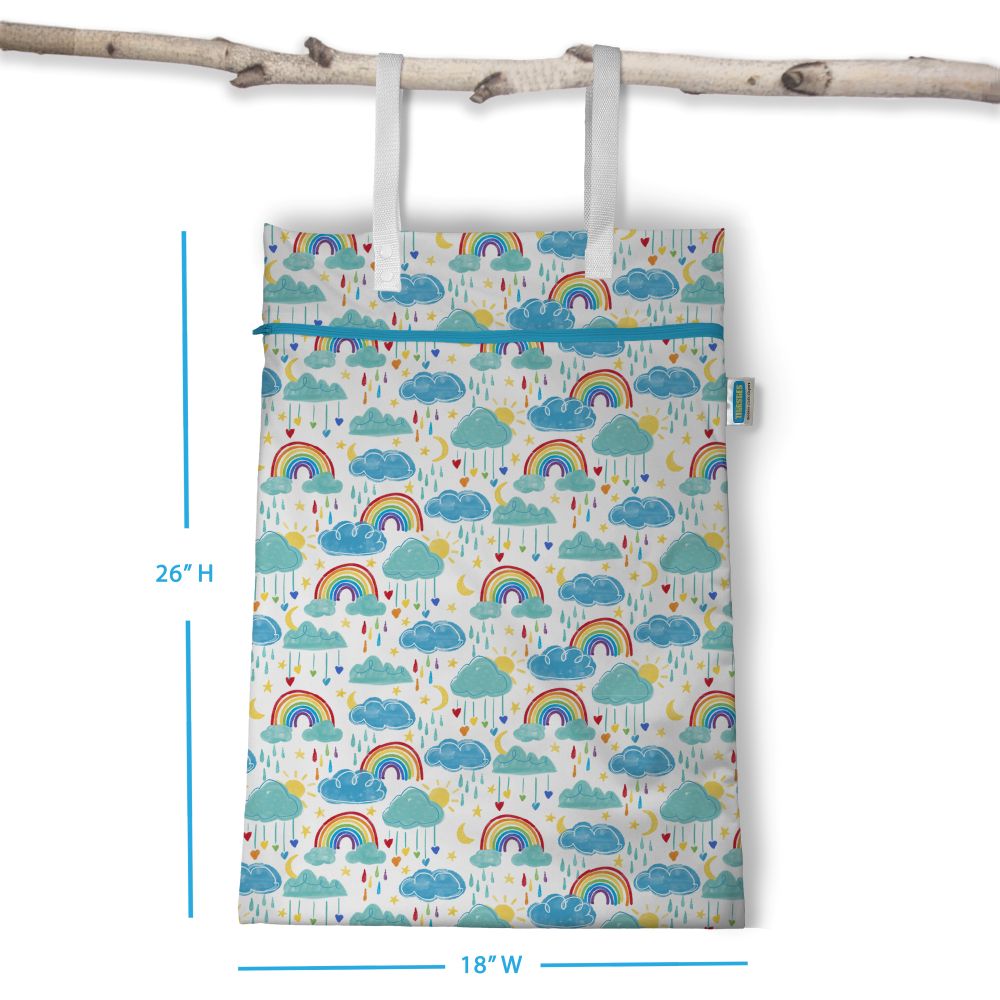 Waterproof interior prevents leaking and wicking and keeps smells contained while storing dirty diapers or laundry. Sturdy straps can be snapped in two directions to be used over a bar or rail or around a doorknob. Easily holds 20 diapers.