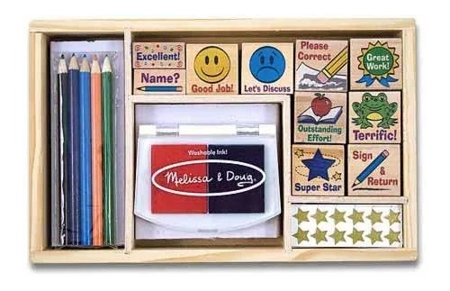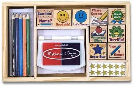 Whether you're a real teacher or a teacher-in-training, this stamp set has everything you need to make your mark! Ten wooden stamps, five colored pencils, a two-color ink pad and lots of gold star stickers will help all your students go to the head of the class. Washable, non-toxic kid-friendly ink.