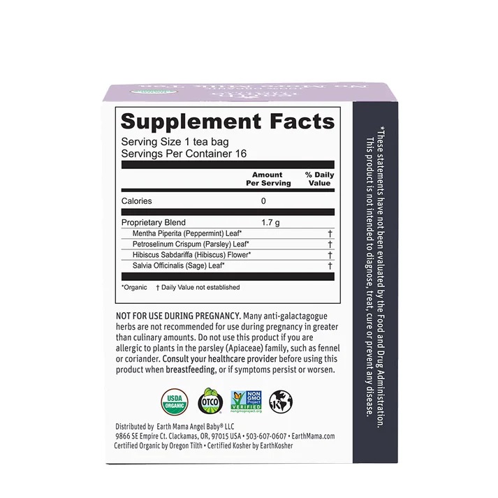 Sometimes, a soothing cup of tea is an act of kindness. Whether from weaning or baby loss, excess or unwanted breast milk can intensify discomfort during an emotional time and cause sore, aching, engorged breasts. Comforting Organic No More Milk Tea is formulated with anti-galactagogue herbs including sage, peppermint and parsley, traditionally used to help reduce the production of breast milk when it is no longer desired. Bonus: a tangy note in the form of Hibiscus flower.