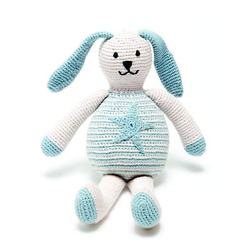 All babies love bunnies. We've made this bunny in 100% organic cotton for a beautiful hand crochet toy that is bound to become a favorite with your little one. A super size for a baby or toddler to cuddle. All Pebble toys are 100% cotton with 100% polyester fill. Handmade by talented artisans in rural production centers and offering women the opportunity of flexible, local, fairly paid work. They are all machine washable and can be tumble dried on a low setting.