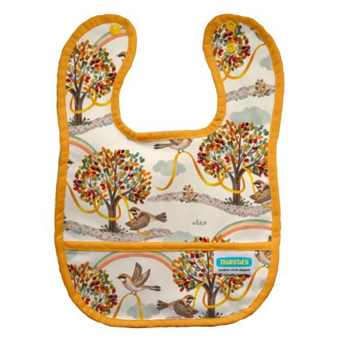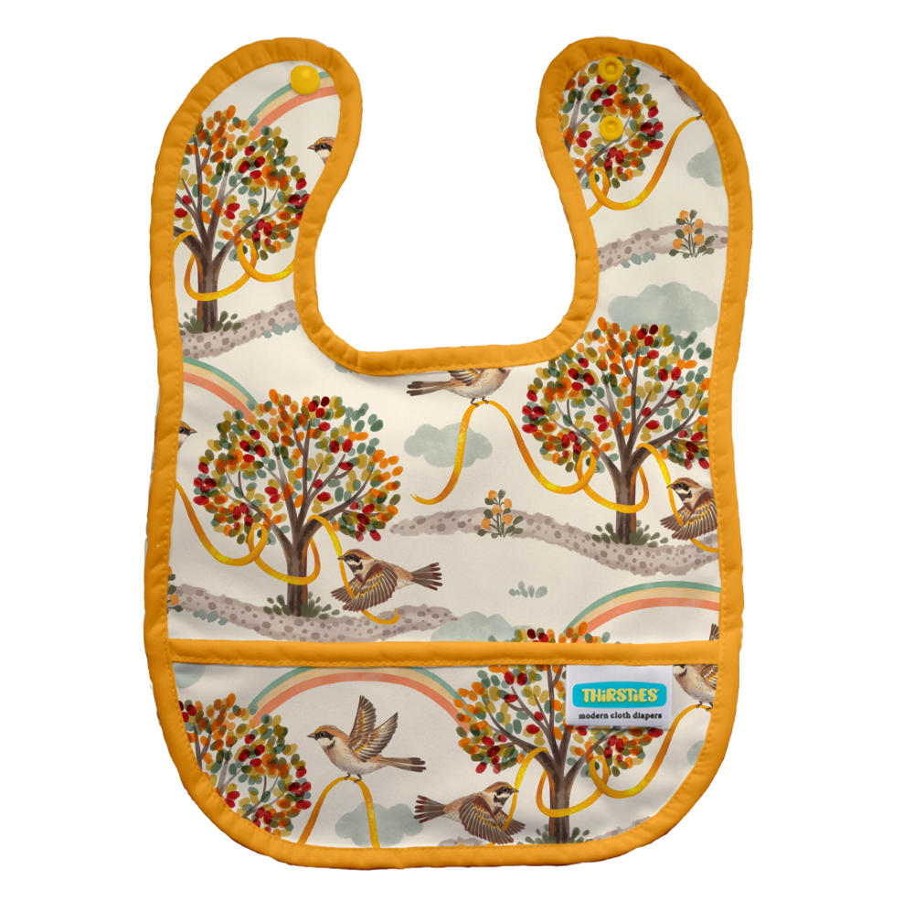 Please welcome Thirsties Pocket Bib to our regular line of products! We’ve made cleanup simple with this easy-to-clean, waterproof bib with two adjustable snap settings and a handy crumb catcher. Thirsties Pocket Bib is made with our waterproof PUL, backed with white mesh, and trimmed with matching binding.
