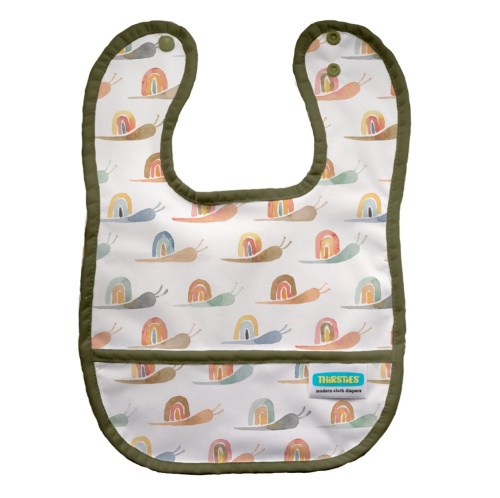 Please welcome Thirsties Pocket Bib to our regular line of products! We’ve made cleanup simple with this easy-to-clean, waterproof bib with two adjustable snap settings and a handy crumb catcher. Thirsties Pocket Bib is made with our waterproof PUL, backed with white mesh, and trimmed with matching binding.