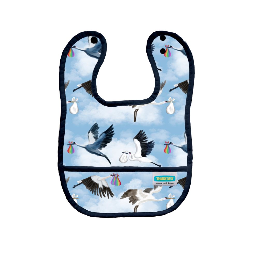 Please welcome Thirsties Pocket Bib to our regular line of products! We’ve made cleanup simple with this easy-to-clean, waterproof bib with two adjustable snap settings and a handy crumb catcher. Thirsties Pocket Bib is made with our waterproof PUL, backed with white mesh, and trimmed with matching binding.