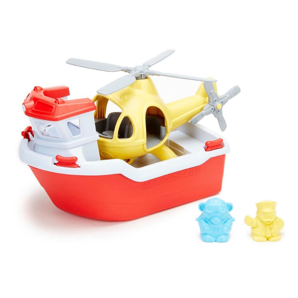 No water rescue is out of reach when the Green Toys™ Rescue Boat & Helicopter gets the call! This two-in-one toy is just as fun on land as it is in water, with a bright yellow, full-size Helicopter nestled on the back deck of the red and white Rescue Boat. The set also includes two characters – a Captain Duck and Pilot Bear – ready to go wherever your child’s imagination takes them. Specially designed to float in the water and open for the dishwasher, this ship is a perfect addition to any bathtub fleet.