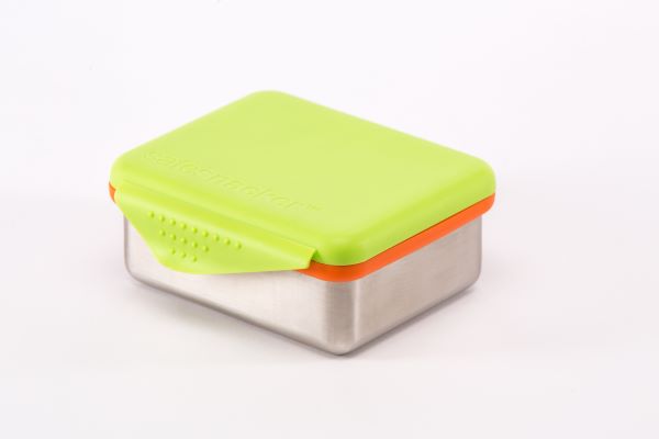 Safe Snacker™ stainless steel lunchbox containers. Favorite features include: single flap collared lid that is easy for little hands to open and close, lid attached on one side and won't get lost, lid also removable for easy washing, stainless steel base and silicone gasket.