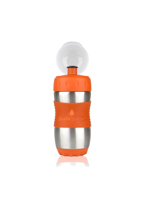 The Safe Sporter is the latest Stainless Steel water bottle product from Kid Basix, the company that brought us the innovative and popular Safe Sippy.  The Safe Sporter is a stainless steel water bottle that stands apart from others with all the thoughtful details that have been put into it.  The TPR sleeve makes it easy to grip no matter how cold or sweaty the bottle may be.  The base has a built in plastic "coaster" to keep it from slipping on surfaces.