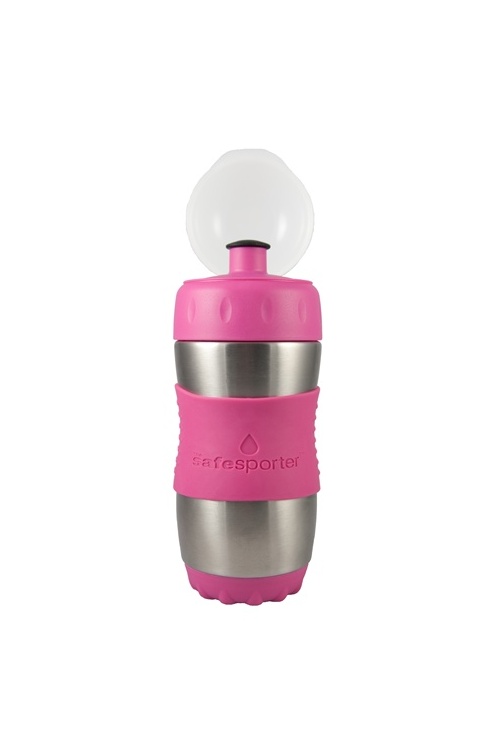 The Safe Sporter is the latest Stainless Steel water bottle product from Kid Basix, the company that brought us the innovative and popular Safe Sippy.  The Safe Sporter is a stainless steel water bottle that stands apart from others with all the thoughtful details that have been put into it.  The TPR sleeve makes it easy to grip no matter how cold or sweaty the bottle may be.  The base has a built in plastic "coaster" to keep it from slipping on surfaces.