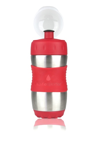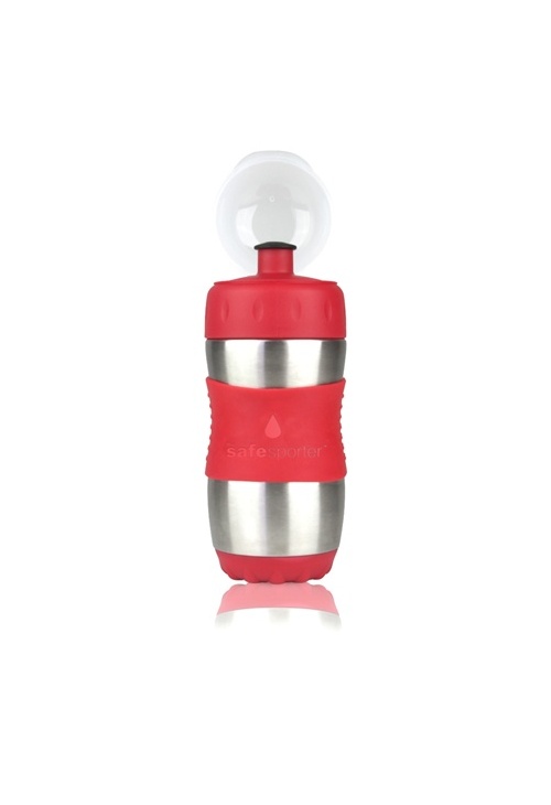 The Safe Sporter is the latest Stainless Steel water bottle product from Kid Basix, the company that brought us the innovative and popular Safe Sippy.  The Safe Sporter is a stainless steel water bottle that stands apart from others with all the thoughtful details that have been put into it.  The TPR sleeve makes it easy to grip no matter how cold or sweaty the bottle may be.  The base has a built in plastic "coaster" to keep it from slipping on surfaces.