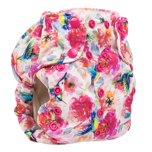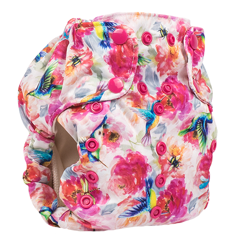 Smart Bottoms one-size, all-in-one diaper is available in bold solid colors with accent colored snaps as well as fun prints. The trim design will fit under most clothing, no need to buy the next size up in clothing just to fit over the diaper. Our one-size diapers can be used on most children from birth until potty.