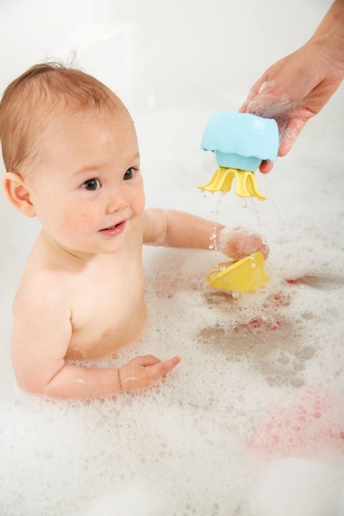 Bring the fun and learning of tide pool and water table play to the bathtub! The 7-piece Green Toys™ Tide Pool Bath Set includes a starfish, scallop, abalone, snail, squid, and jellyfish, as well as a seaweed-patterned storage bag. Made in the USA from 100% recycled plastic milk jugs, each of the six shells and creatures in the set are specially designed to interact with and pour water in a different way. Scoop up water with the abalone and create a cascading waterfall with the holes along the edge, or fill the jellyfish and watch the water run down and out each of the legs. The palm-sized shells are the perfect size for scooping and pouring water to wash little ones in infant tubs, while the whole set is also great for the beach and backyard. When it’s time for cleanup, collect all the pieces in the storage bag (made from 100% recycled plastic bags!). The holes throughout the sides and bottom of the bag allow water to drain out and pieces to dry between uses.