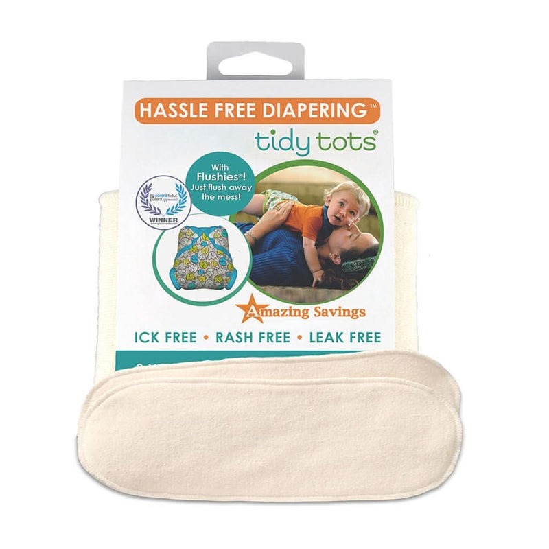 Set of two organic, hemp No Fold™ Diapers. Lightweight yet super absorbent and durable, and no folding necessary. They snap right into Tidy Tots patented covers for a secure, comfy, no-leak fit.